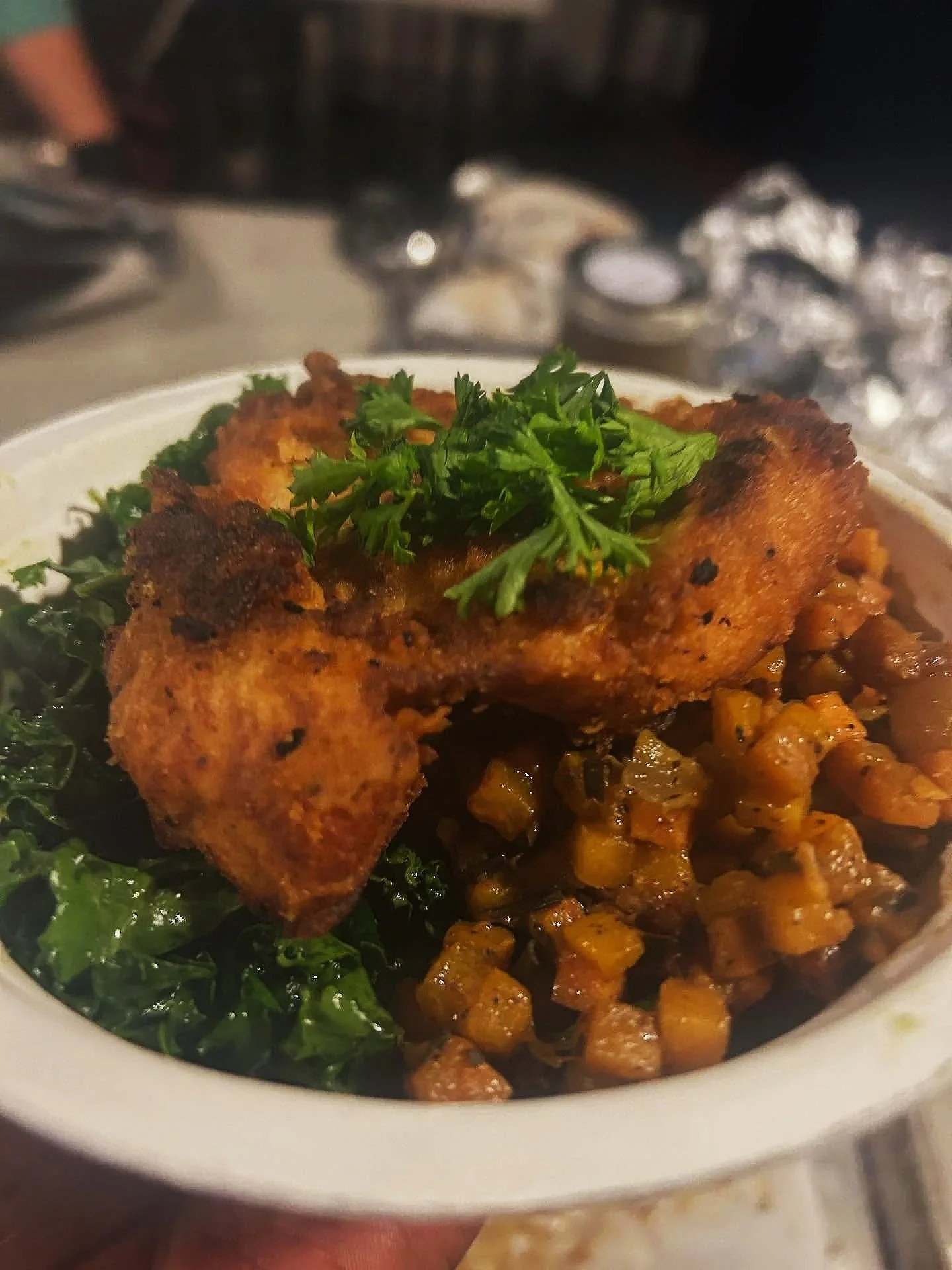 Our fried chicken snuggled up with massaged kale and sweet potato hash!